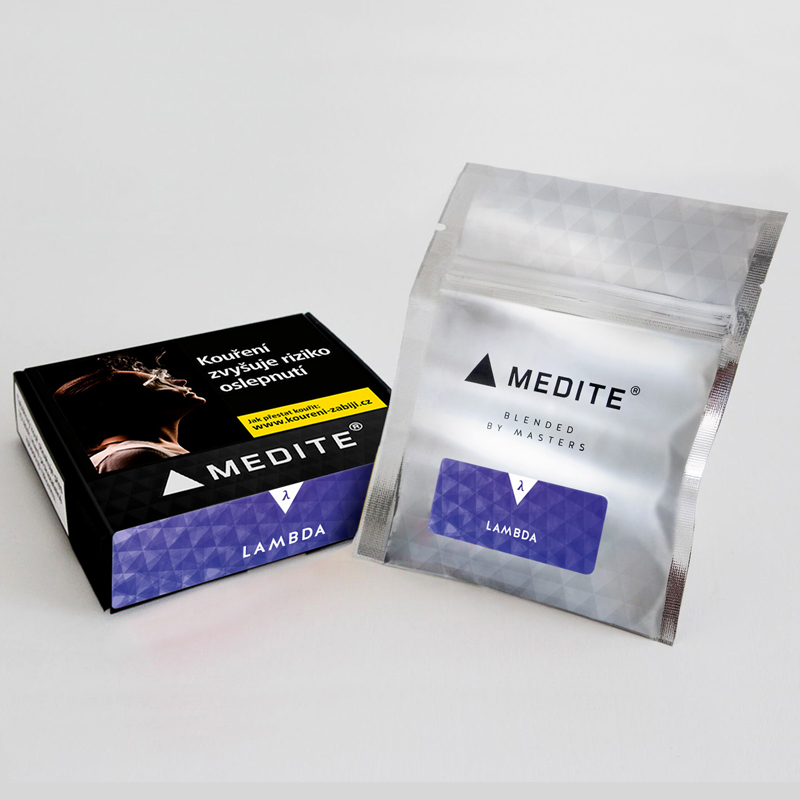 Triangles and letters of the Greek alphabet. The symbols decorating the boxes of the Czech Medite tablet, hiding a bag with fifty grams of exquisite flavour.
