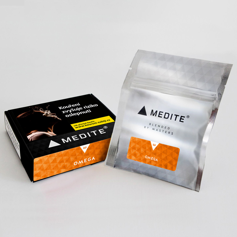 Triangles and letters of the Greek alphabet. Symbols decorating the box of the Czech Medite tablet, which hides a bag with fifty grams of exquisite flavour.