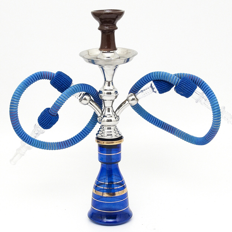 Small hookah from the manufacturer Top Mark with two hoses. The colour design is determined by the colour of the hose and base. The base of the hookah is hand painted, so each hookah is completely original thanks to the painting on the glass. The hookah is 46 cm high and is packed together with all necessary accessories in the original cardboard box.