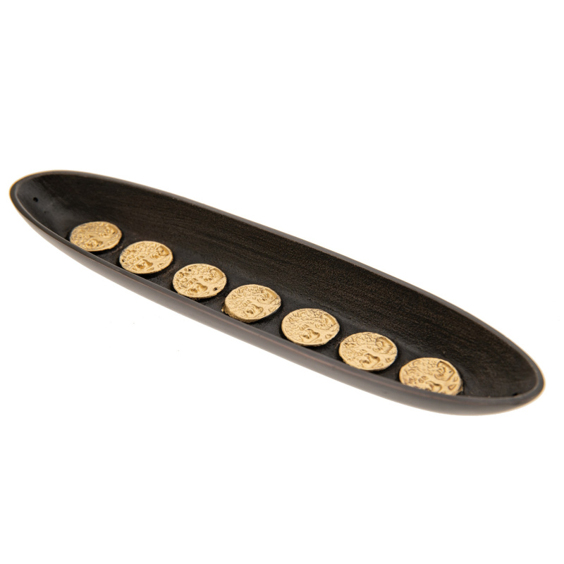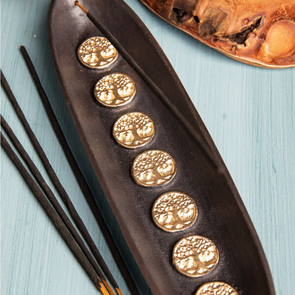 The metal boat-shaped holder is a really interesting and practical accessory for incense sticks. Its design makes it easy to remove burnt ash. Inside the holder are gold-embellished flowers of life, which add even more charm to this item.