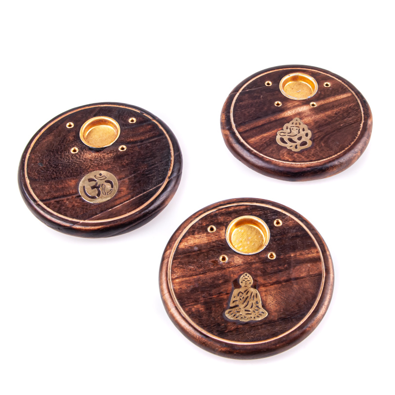 Beautiful round wooden holder with golden Buddha motif. The holder can be used for both incense cones and sticks.