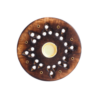 Round wooden holder decorated with a gold star for incense sticks and cones.