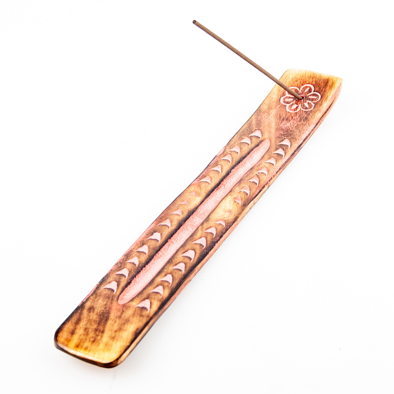Incense stick holder in the shape of a ski, pink colour, decorated with hand-carved motifs.