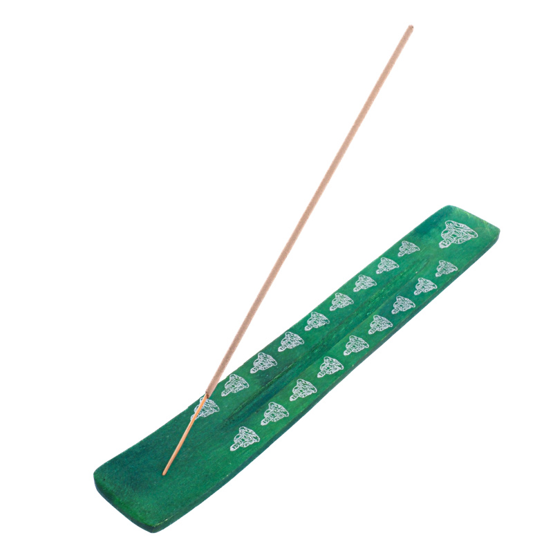 Incense stick holder- ski-shaped Manju Buddha, green, decorated with printed motifs.