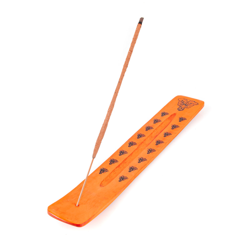 Traditional incense stick holder, ski-shaped, Manju Buddha in orange colour