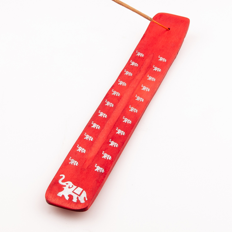 Incense stick holder- ski-shaped Manju Elephant, red, decorated with printed motifs.