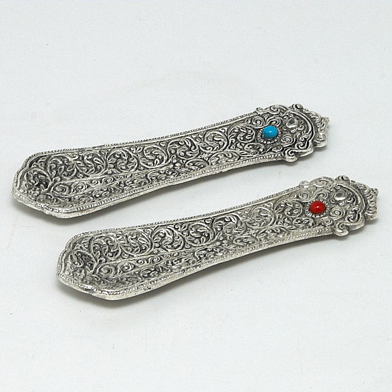 This Indian metal holder for burning cones and Indian incense sticks is decorated with ornaments and coloured lens. There are three metal legs on the bottom of the holder. The holder is stable.