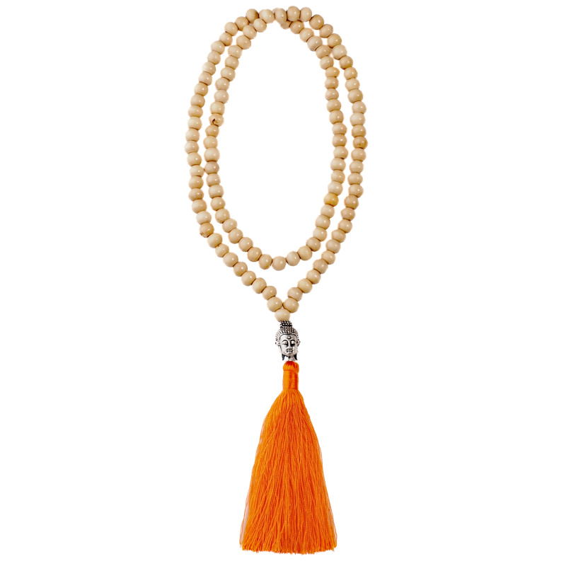 Traditional mala handcrafted on the exotic island of Bali from light wooden beads, adorned with a metal Buddha's head and an orange tassel.