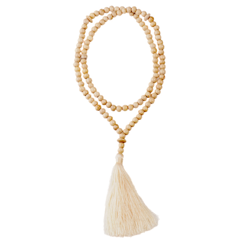 Traditional mala handcrafted on the exotic island of Bali from wooden beads in natural light color.