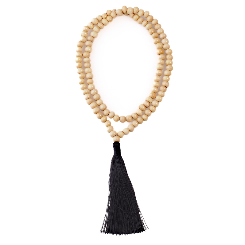 Traditional mala handcrafted on the exotic island of Bali from light wooden beads with a black tassel.