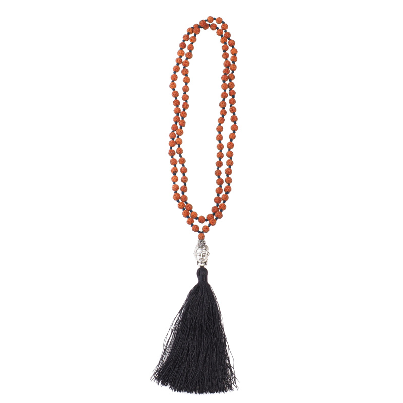 Traditional mala handcrafted on the exotic island of Bali made of Rudraksha seeds, adorned with a metal element of Buddha's head and a black tassel.