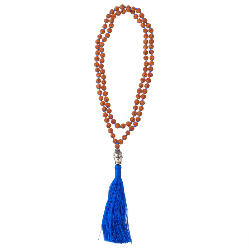 Traditional mala handcrafted on the exotic island of Bali made of Rudraksha seeds, adorned with a metal element of Buddha's head and a blue tassel.
