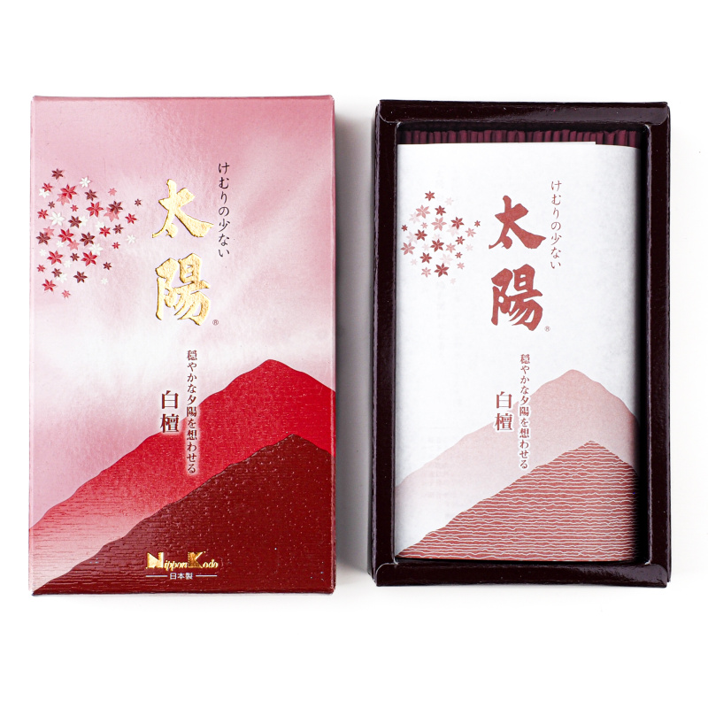 Taiyo Byakudan means sunset. Sunlight is an anthem, celebrating life itself. Morning, afternoon, evening... The strength of the sun's rays changes, but the blessing of light remains. Evening bathes the horizon in a mysterious pinkish light and lights up the world like a dreamscape. The afternoon sun caresses our faces and brings joy and hope for tomorrow into our lives. Japanese Taiyo Byakudan Scented Sticks bring us a romantic scent of mature sandalwood, as soft as the glow of the late afternoon sun.