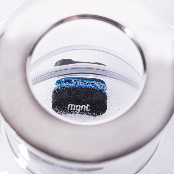 The mgnt squeegee comprises two parts, which are equipped with strong magnets and soft fabric. It can handle any type of base including cut bases (up to 1.5 cm thick), and is compact and easily portable. It mechanically cleans the base inside and outside as well, and gets rid of dirt where brushes and other methods fail. The textile liner is both durable and gentle, and will not scratch or damage the base in any way.