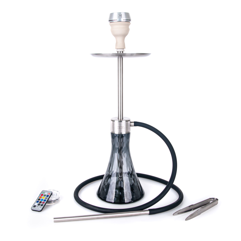 The marvin Lite Premium stem is made of high-quality food-grade steel, styled in a stick-type construction. The connection to the base is provided by a short but massive thread. The manufacturer has played with the base itself in the Lite Premium hookahs, and the hand-blown patterned glass in colour variations gives the hookah a luxurious look. And, of course, there is also a hole for the LED module.