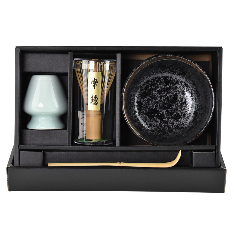 This set includes a stoneware bowl, a bamboo Chashaku matcha spoon, a bamboo Chasen whisk, and a ceramic Chasen holder.