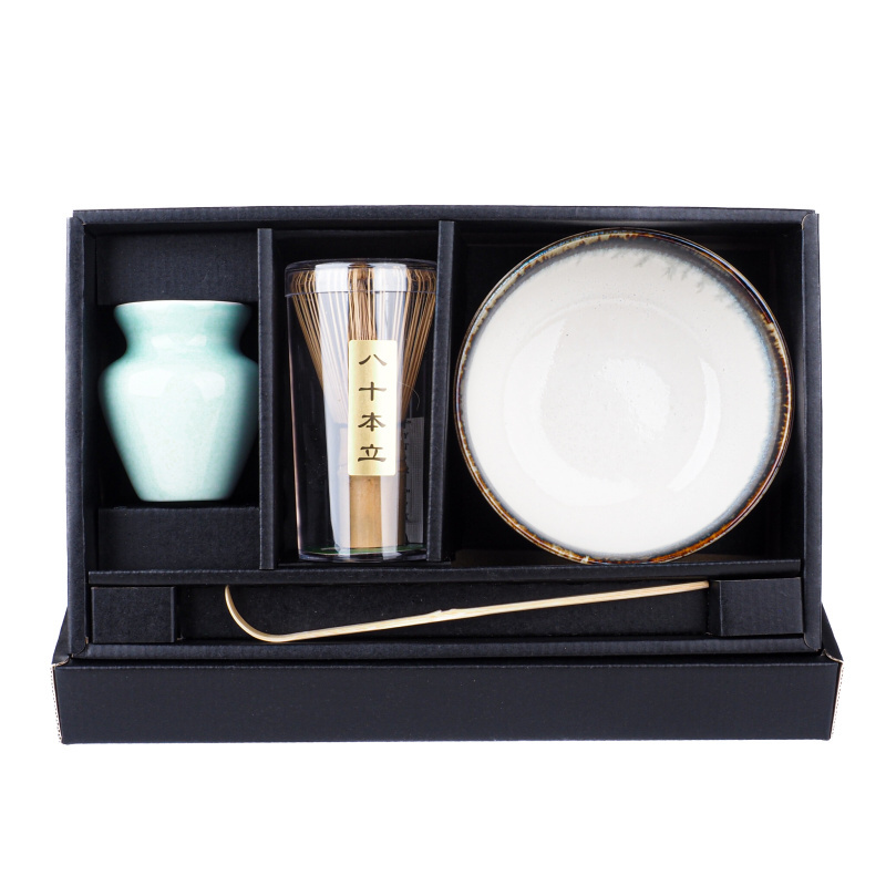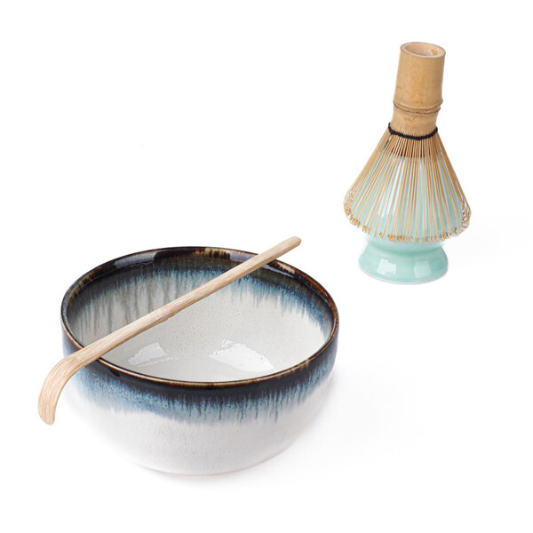 This set includes a stoneware bowl, a bamboo Chashaku matcha spoon, a bamboo Chasen whisk, and a ceramic Chasen holder.