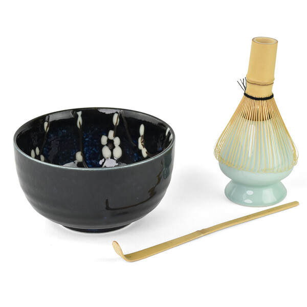 This set includes a stoneware bowl, a bamboo Chashaku matcha spoon, a bamboo Chasen whisk, and a ceramic Chasen holder.
