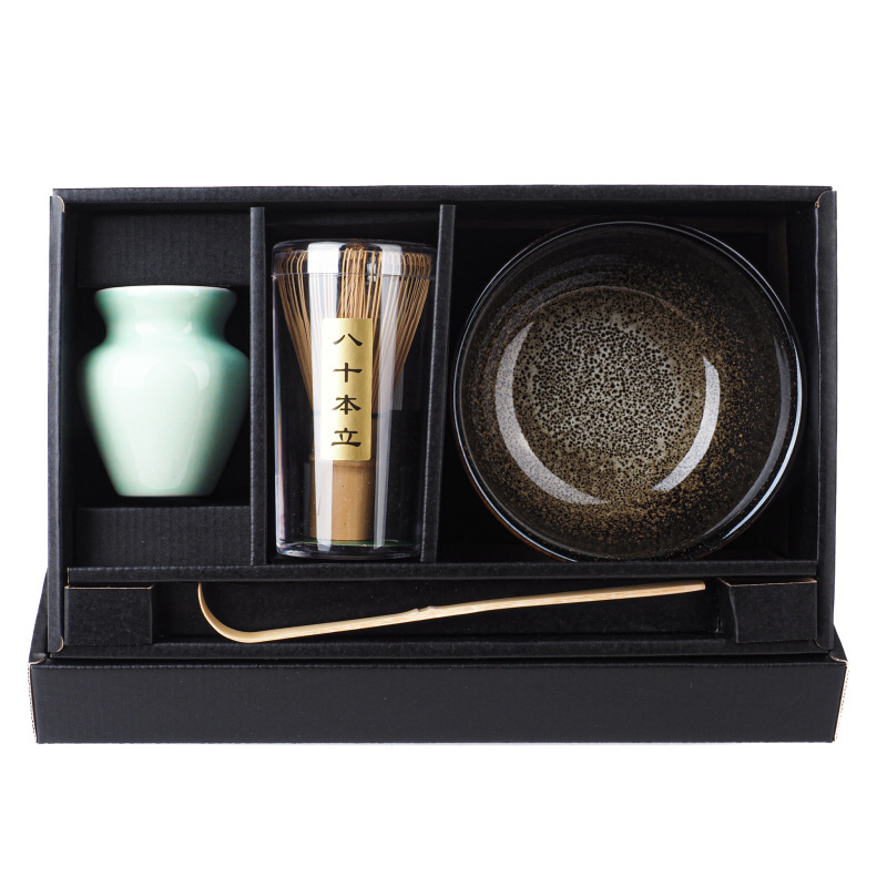 This set includes a stoneware bowl, a bamboo Chashaku matcha spoon, a bamboo Chasen whisk, and a ceramic Chasen holder.