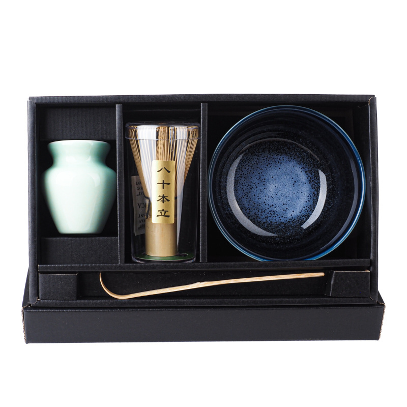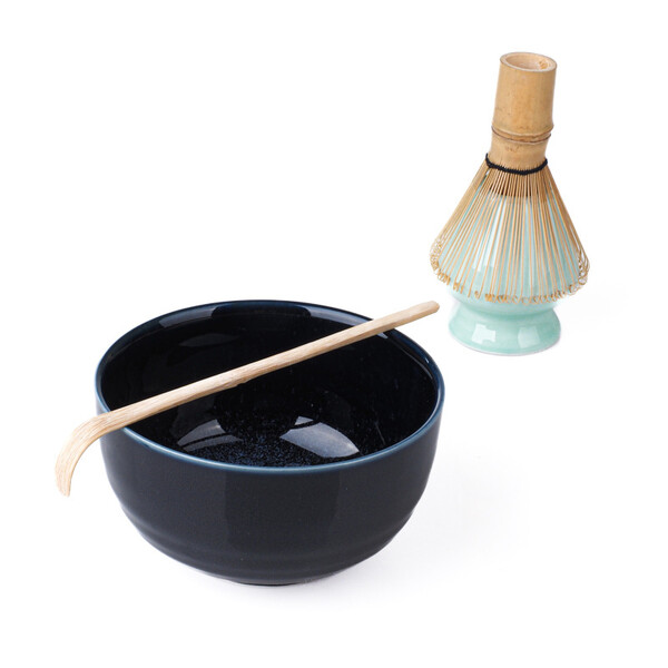 This set includes a stoneware bowl, a bamboo Chashaku matcha spoon, a bamboo Chasen whisk, and a ceramic Chasen holder.