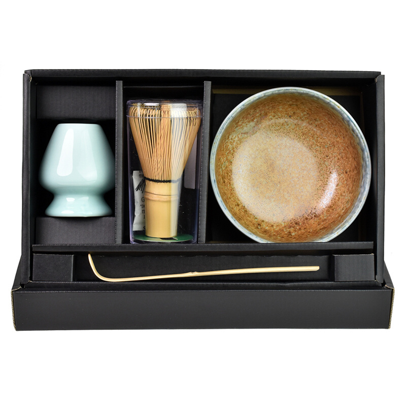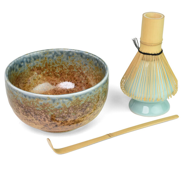 This set includes a stoneware bowl, a bamboo Chashaku matcha spoon, a bamboo Chasen whisk, and a ceramic Chasen holder.