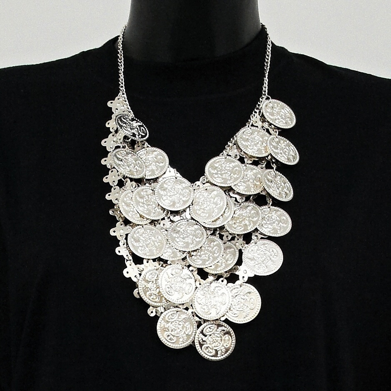 Beautiful solid Hapu belly dance necklace, decorated with large pennies, sliding clasp, silver colour