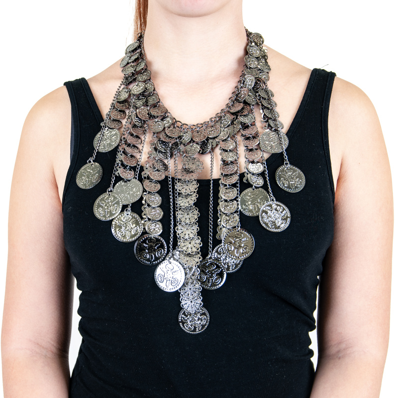 Beautiful Makara belly dance necklace, decorated with stylized flowers and pennies, black
