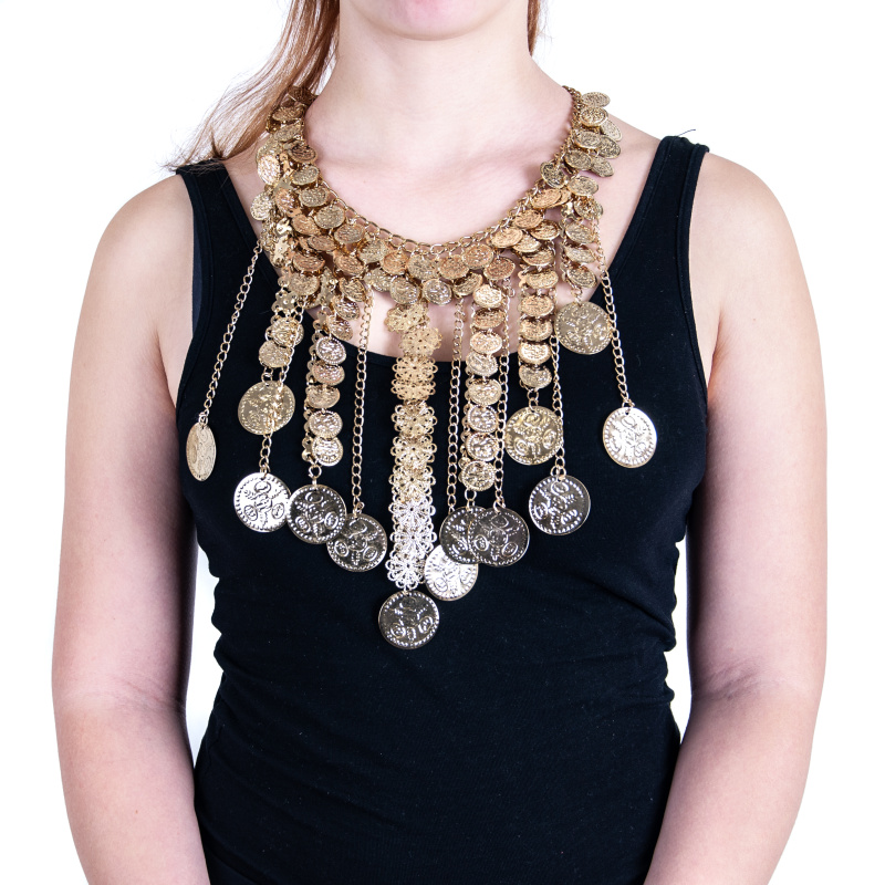 Beautiful Makara belly dance necklace, decorated with stylized flowers and pennies, golden colour