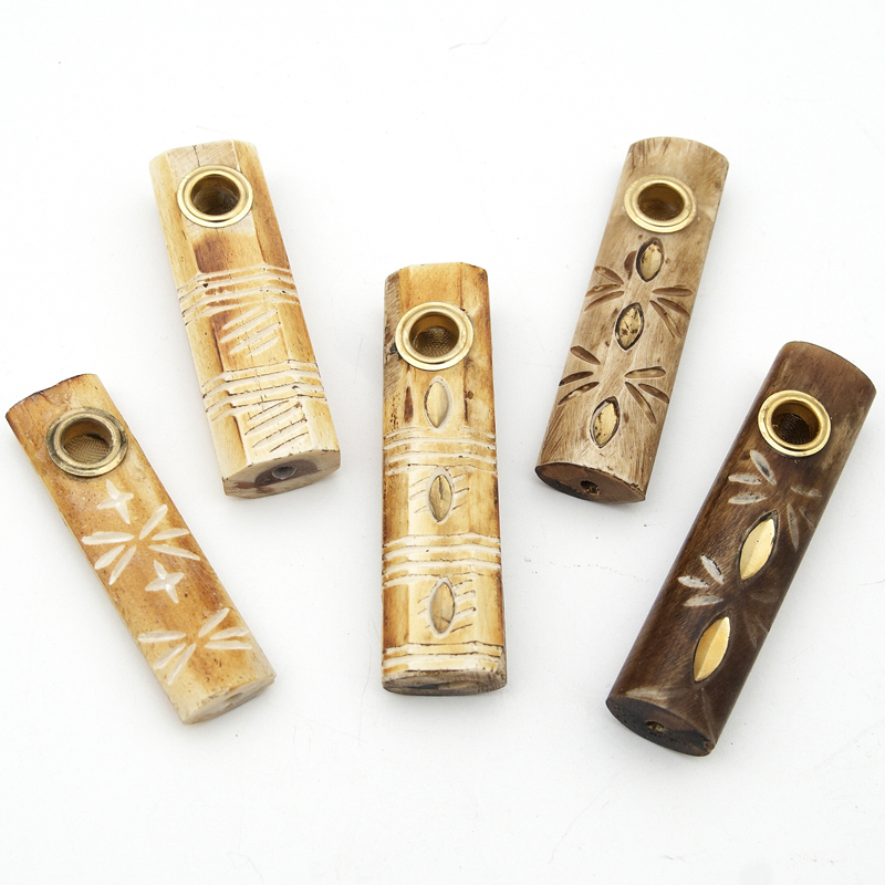 Excellent flat slide made of bone. The pipe has a metal protection on the bowl and is decorated with a carving on the top.