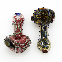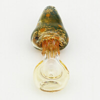 Excellent shot glass made of durable duran tempered glass with a large curved pot. The pipe has a curved mouthpiece and a small hemp leaf motif on the bowl.