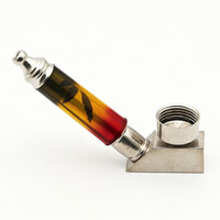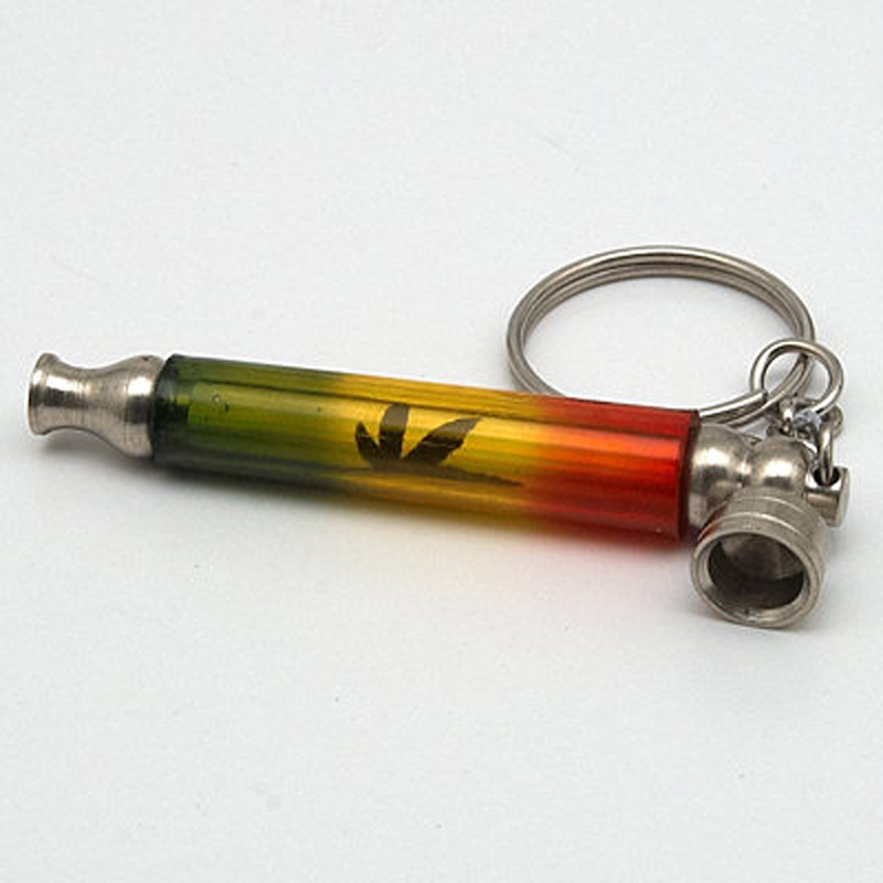 Small metal loop on a chain with a ring for attaching to keys. The pipe is decorated with a traditional rasta colour triple combination and a small green leaf.