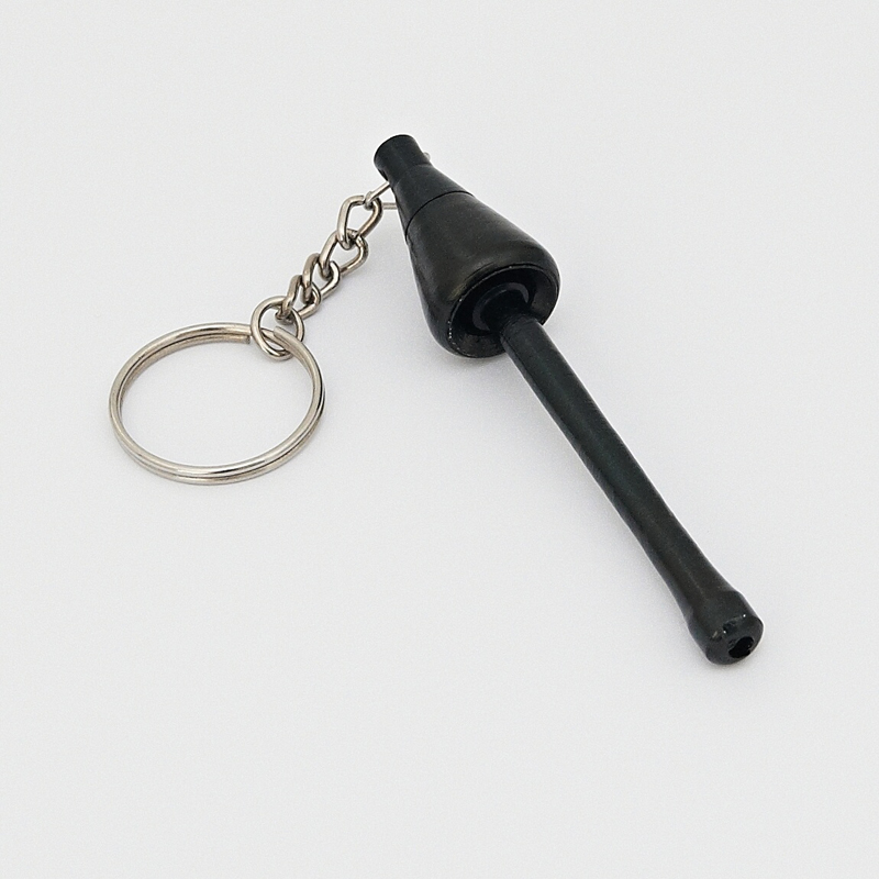 Smaller foldable sponge-shaped loofah made of metal, black colour. The pipe is on a chain with a ring for attaching to a belt.