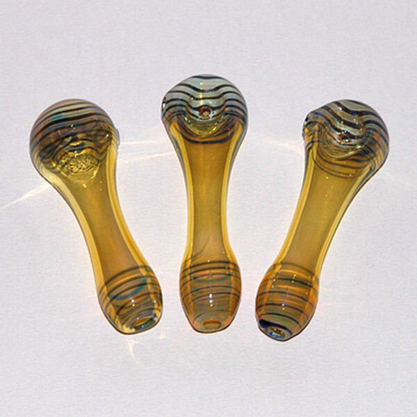 Perfect smaller yellowish slug made of durable pyrex borosilicate glass with side turbo. The pipe is decorated with blue stripes on the bowl and mouthpiece.