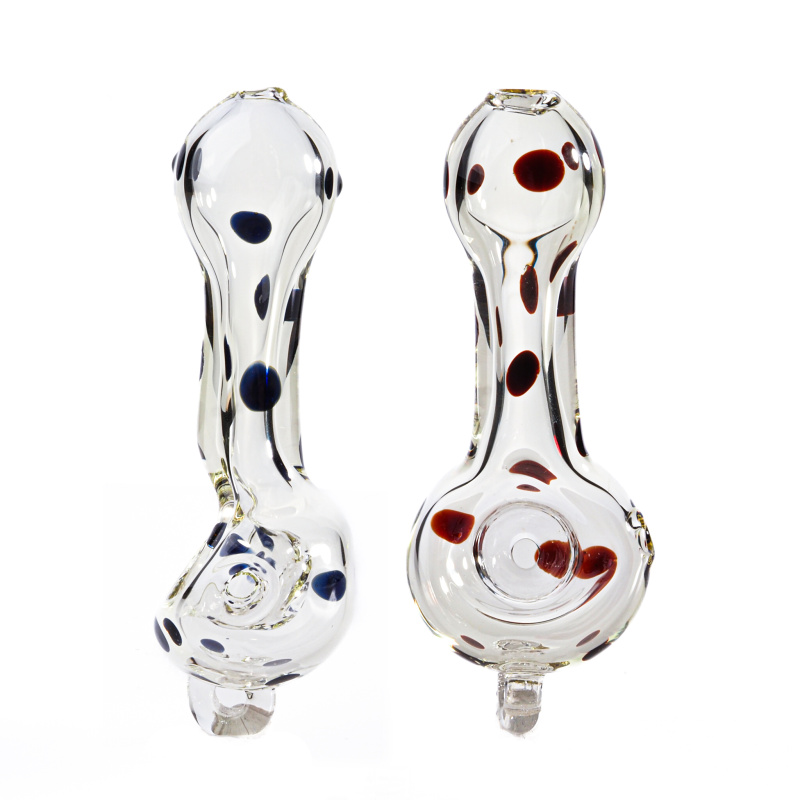 Small slug made of durable borosilicate pyrex glass with side turbo and small loop for hanging on the kettle. The whole pipe is decorated with small coloured dots.