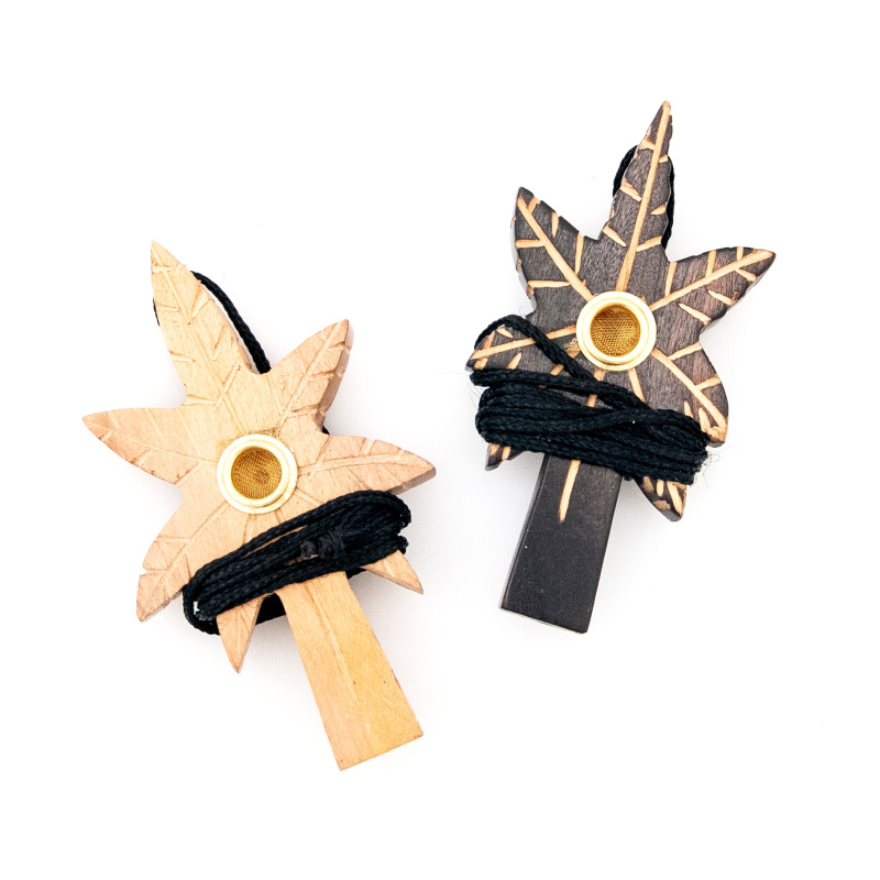 An interesting wooden loop in the shape of a hemp leaf, on a string for hanging around the neck.