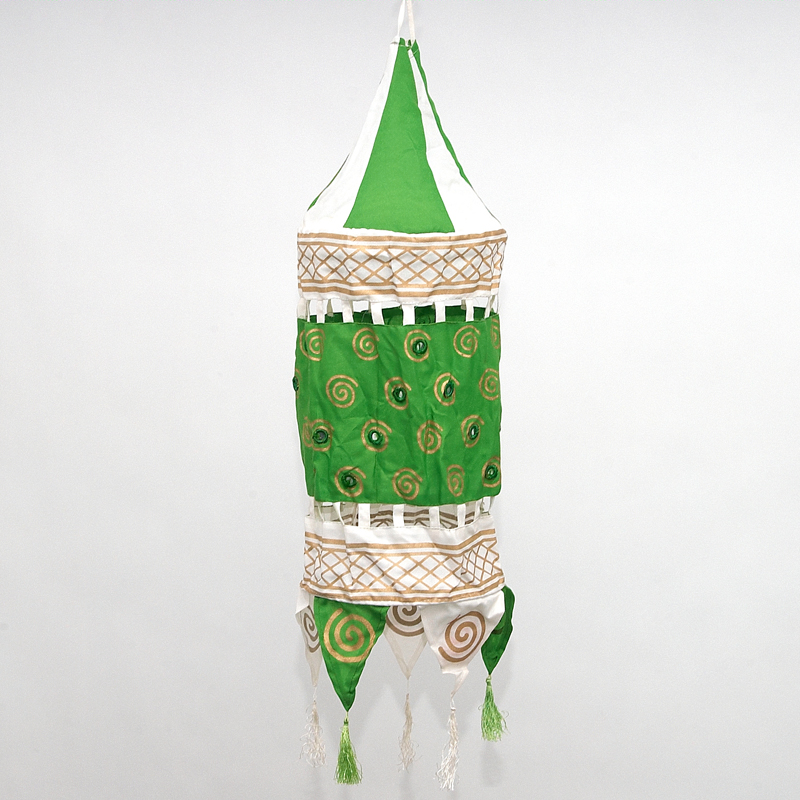 These beautiful textile lanterns are adorned with spirals and small mirrors.