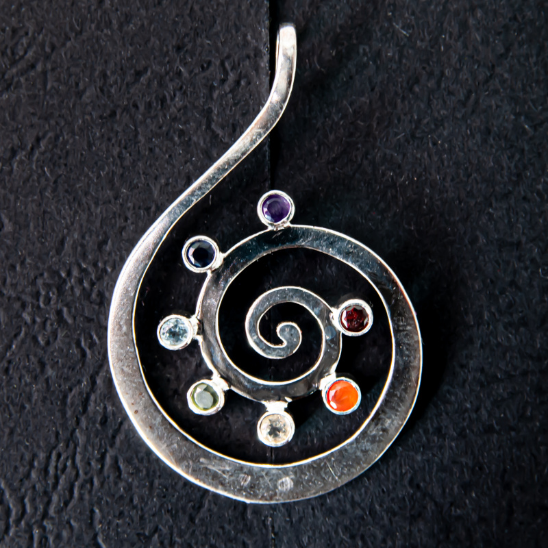 Silver Kundalini Pendant is made of 925 silver and semi-precious stones: garnet, carnelian, citrine, peridot, blue topaz, iolite and amethyst. Kundalini is literally a snake or serpentine force, residing at the very roots of a person's foundation - wrapped around the base chakra of Muladhara. When this force is awakened, it rises upwards, passes through the energy centres (chakras) and when it reaches the crown chakra, it reaches its goal - enlightenment.