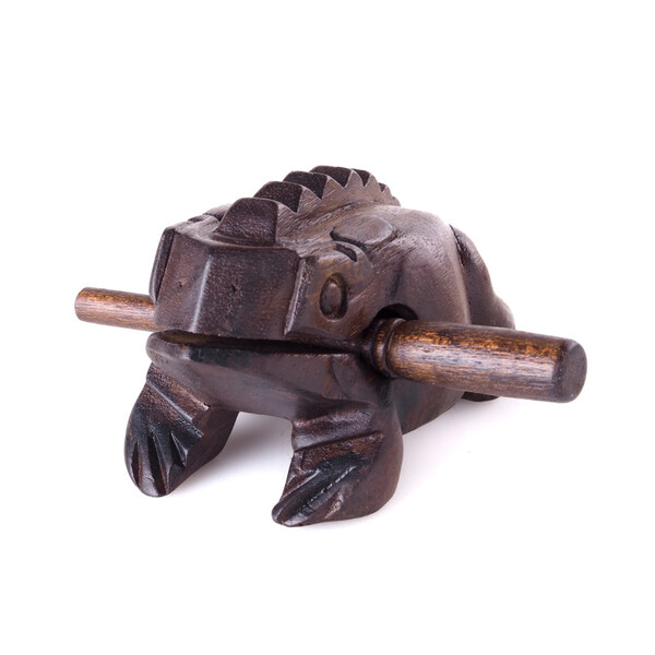 Hand-carved percussion instrument frog in dark colour, length 14 cm