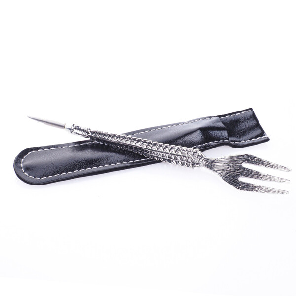 Multifunctional tobacco preparation tool in the form of a fork with punch in silver colour
