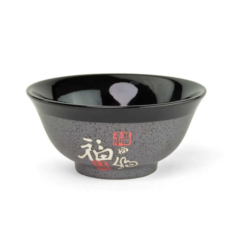Practical deeper porcelain bowl with a volume of approx. 480 ml with a smooth glossy black glaze on the inside is perfect for serving miso soup, salads or rice. But it is also perfect for serving any other delicacy you decide to serve in it. The outside of the bowl is decorated with a black border and irregular dotting along with white and red characters on a grey background.