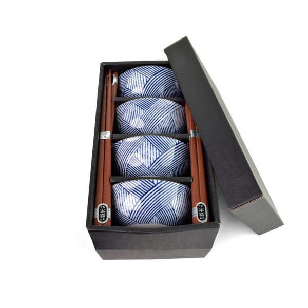 This charming Japanese set of four smaller bowls with a blue and white motif is made of high quality and non-toxic materials and packaged in the original box. It can thus also serve as a beautiful and novel gift. The set also includes four pairs of wooden chopsticks.