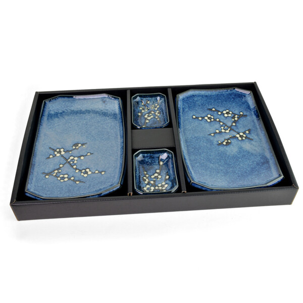 Original Japanese set in cobalt blue with a motif of tiny sakura flowers in the form of two sushi trays and two soy sauce bowls in traditional style. The set is made of high quality and health-safe materials and packaged in the original box. It is perfect as a gift.