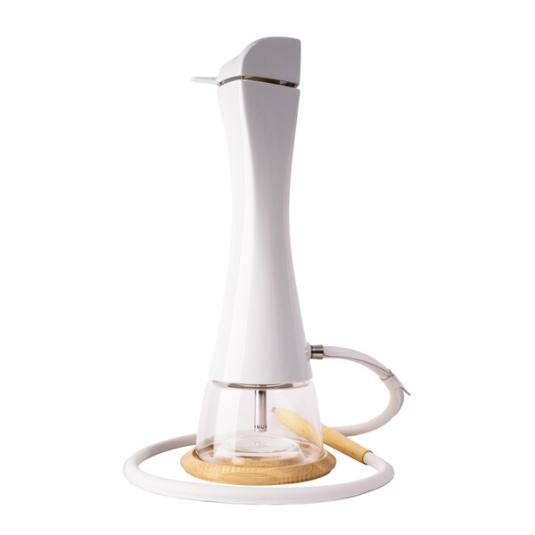 The Shisha Original Aer hookah includes an undecorated Lenis base with a steel thread, a silicone hose hand-lined with white Italian cowhide, a stoneware bowl, a porcelain tarbush, a wooden Circum handle, and a maple-decorated stand with LED backlighting. The hookah is stamped with a unique serial number, which is also included in the enclosed certificate, so each piece is a complete original.