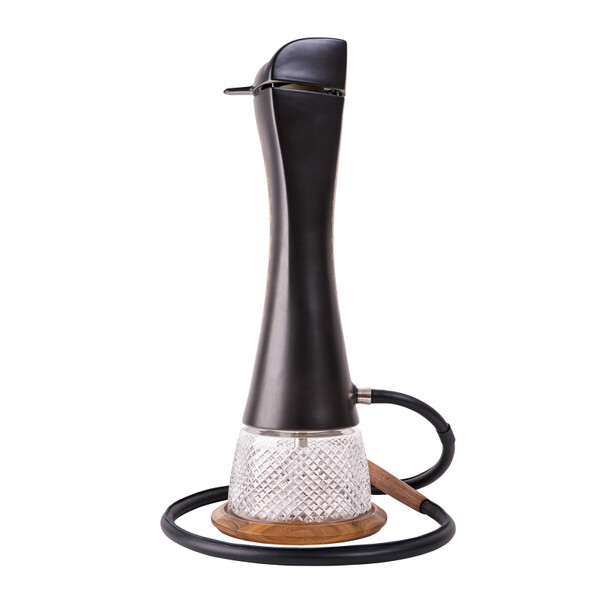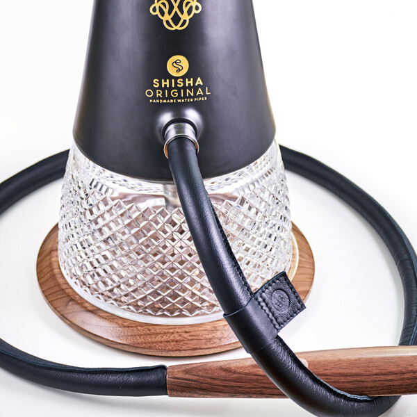 The Shisha Original Atra hookah includes an ornate Parum Cubica base with a steel thread, a silicone hose hand-lined with black Italian cowhide, a stoneware bowl, a porcelain tarbush, a wooden Figura handle, and a walnut-finished wooden stand with LED backlighting. The hookah is stamped with a unique serial number, which is also included in the enclosed certificate. Each piece is, therefore, a complete original.