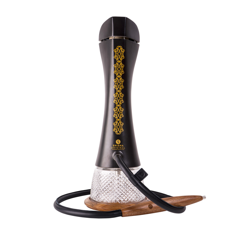 A design jewel for the lovers of luxury. The distinctive golden ornament on the front of the black porcelain stem of the Shisha Original Atra hookah from the Aristo series is hand sandblasted and the base made of Czech crystal glass in the top version Parum Cubica is also eye-catching. On the stem, you will also find the brand's golden logo placed above the hose outlet.