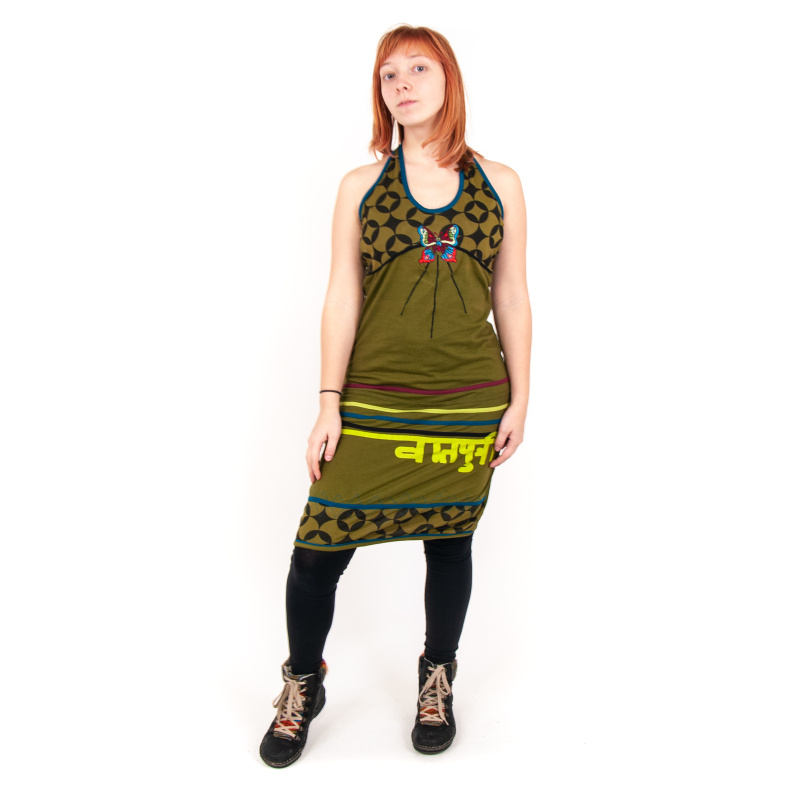 Comfortable cotton short dress Asja M, decorated with secret writing, khaki colour