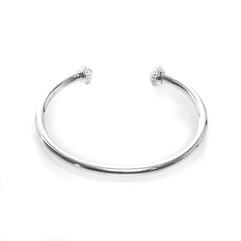 Simple silver bracelet with decorated beads on both ends.