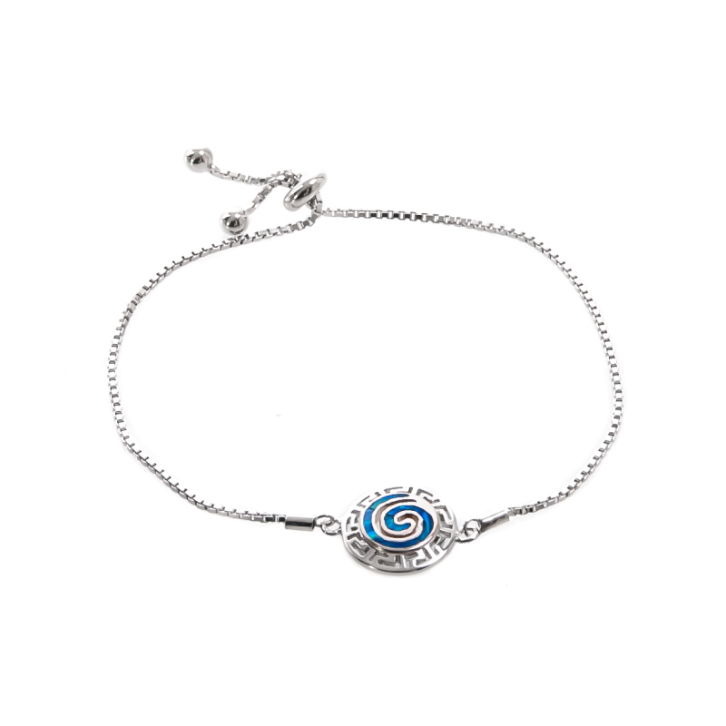 Elegant silver bracelet with a charming medallion. The locket is in the shape of a brooch, decorated with spirals with an embedded blue synthetic opal.