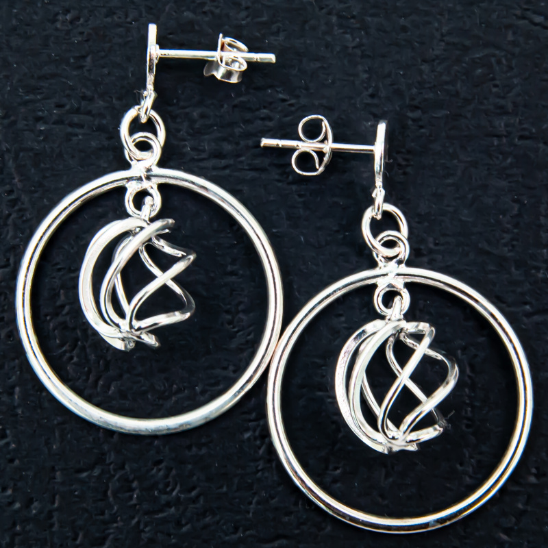 Elegant moving silver earrings with a spiral ball suspended in the middle of the circle.