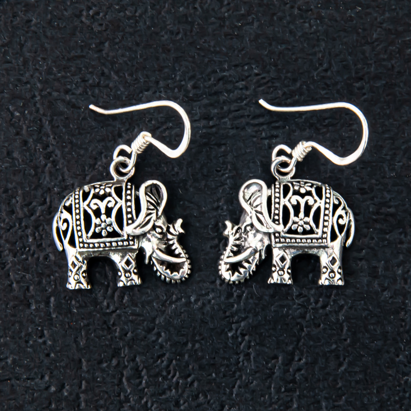 Stylish silver earrings in the shape of an elephant, decorated with ornaments.